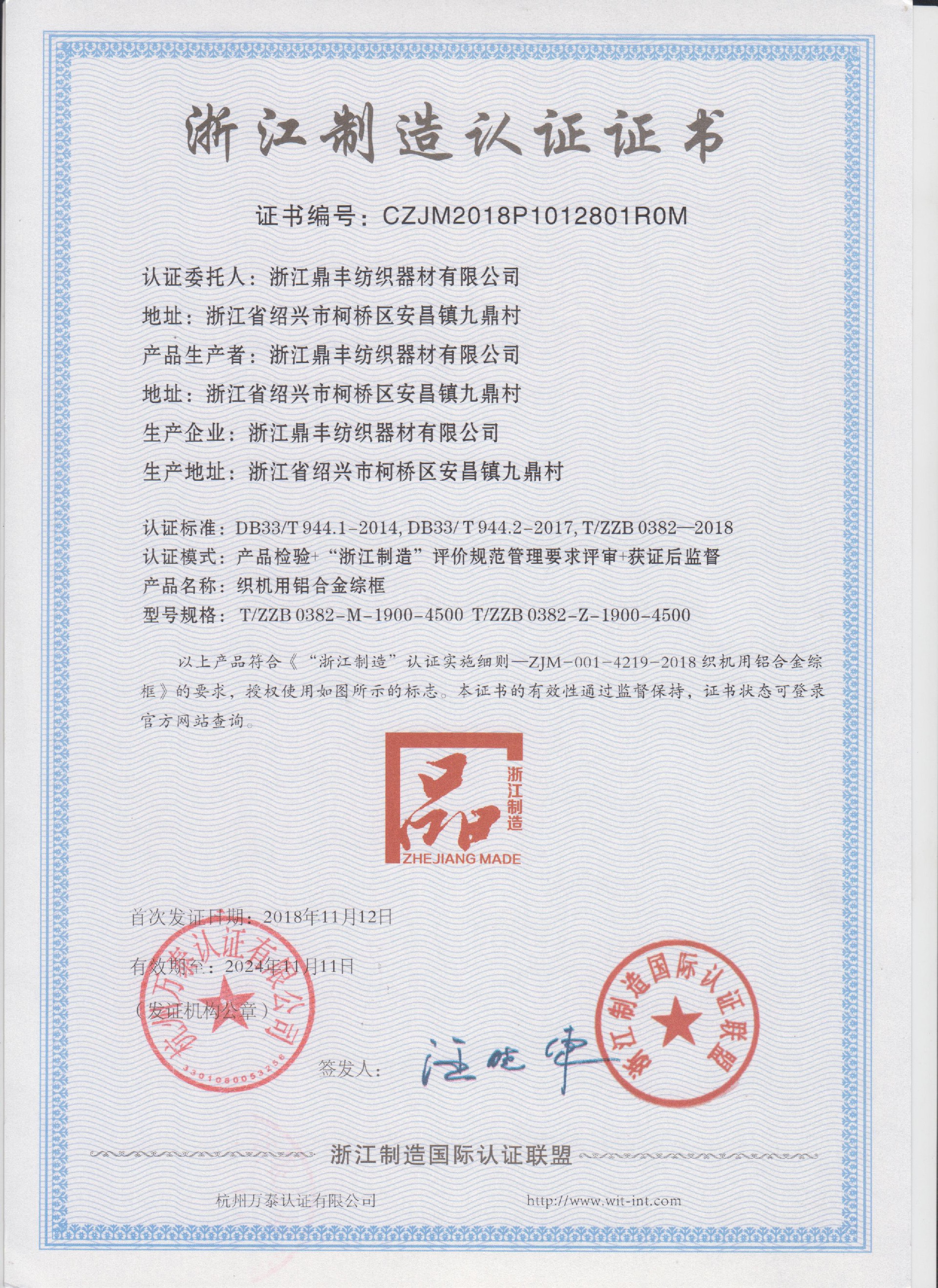 1、貴公司是一家專業(yè)生產(chǎn)各類(lèi)無(wú)梭織機(jī)鋁合金鋼筘、綜框、鋼片綜、停經(jīng)片、經(jīng)軸、織軸和卷布輥等產(chǎn)品及配件的民營(yíng)企業(yè)。公司成立30多年迅速發(fā)展、占領(lǐng)市場(chǎng)的秘決是什么?余定雅:是高品質(zhì)的產(chǎn)品,完善的售后服務(wù)和大規(guī)模的生產(chǎn)能力保證了浙江鼎豐紡織器材有限公司的產(chǎn)品銷(xiāo)售量在國(guó)內(nèi)獨(dú)占鰲頭。為了與全球市場(chǎng)經(jīng)濟(jì)接軌,鼎豐紡